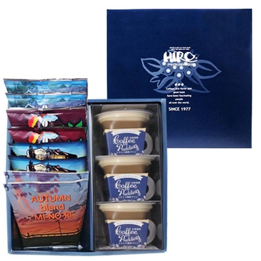 自家焙煎珈琲の香ばしい香りが感じられる珈琲プリンとドリップコーヒーギフト。コーヒーの味をしっかり感じるプリンは冷やしてからお召し上がりください。