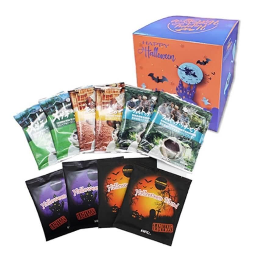 季節限定のドリップコーヒー「ハロウィンブレンド」とスイーツにあうドリップをセットにして、ハロウィン限定BOXに入れてお届け。