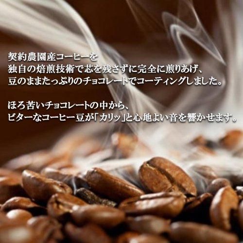契約農園産コーヒーを独自の焙煎技術で芯を残さずに完全に煎りあげ、豆のままたっぷりのチョコレートでコーティングしました。ほろ苦いチョコレートの中から、コーヒー豆が「カリッ」と心地よい音を響かせます。ついつい食べ過ぎてしまうやみつきチョコです。