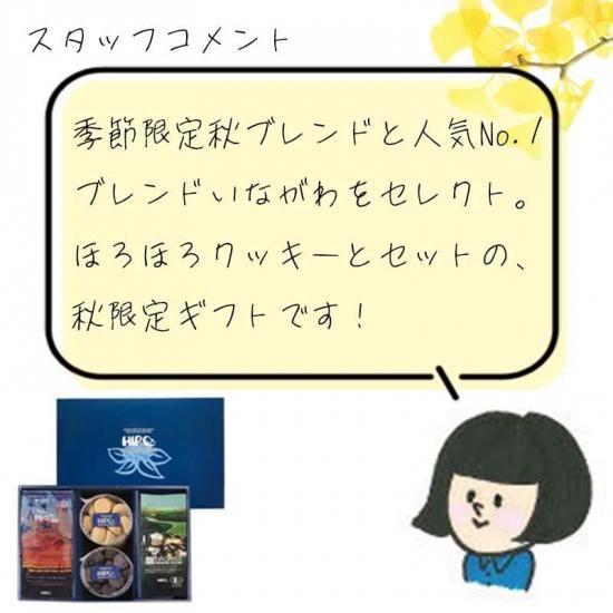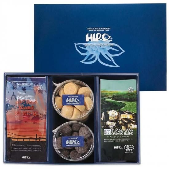 ヒロ特製クッキーと、秋限定のブレンド【みのり】と人気のオーガニックコーヒーの「オーガニックブレンドいながわ」を詰め合わせました。