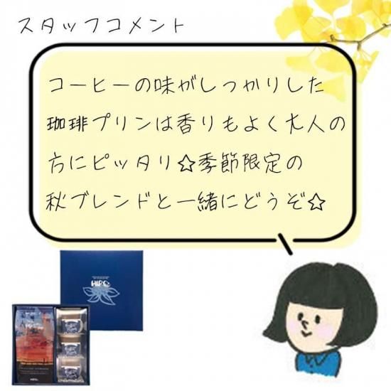 とろとろ食感がくせになる「自家焙煎とろとろ珈琲プリン」と、秋限定のブレンド「みのり」200gを詰め合わせました。