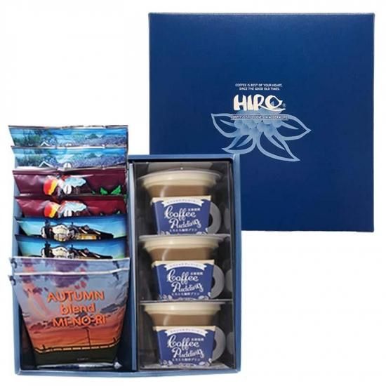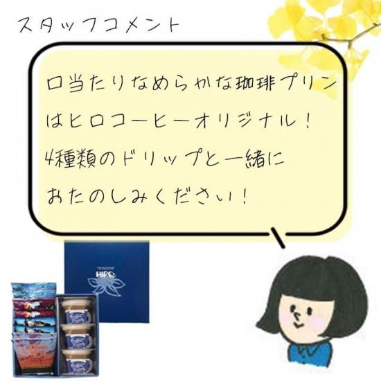 とろとろ食感がくせになる「自家焙煎とろとろ珈琲プリン」と、秋限定のブレンド【みのり】を含むヒロ人気のドリップコーヒー4種8個を詰め合わせました。