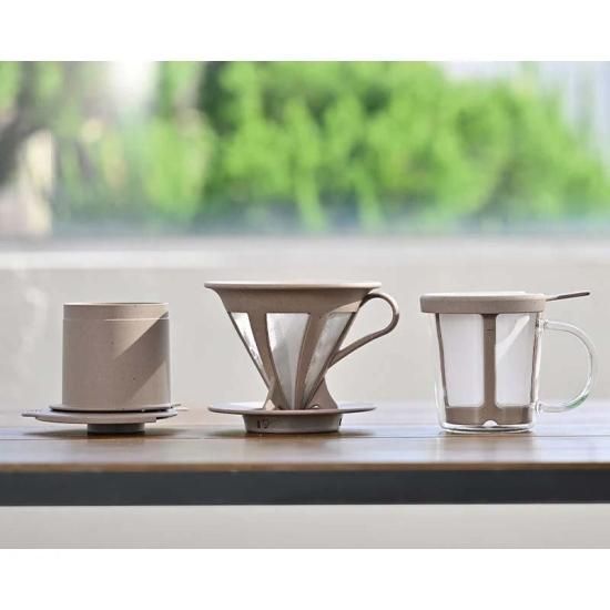 微粉の出にくい細かいメッシュのペーパーレスドリッパーと耐熱ガラスマグのセットです。フタは使用後のストレーナー置きになります。