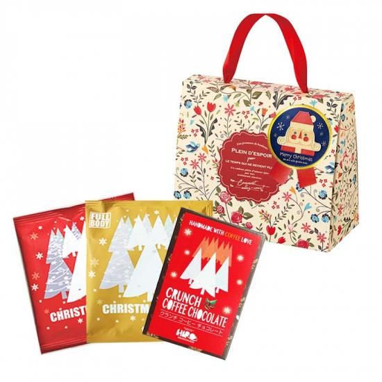 季節限定ブレンド「クリスマスブレンド・ライト」、「クリスマスブレンド・フルボディ」のドリップコーヒーと、深煎りの自家焙煎コーヒー豆を粗く粉砕し、ミルクチョコレートの中に入れたコーヒータブレットをセットにしました。